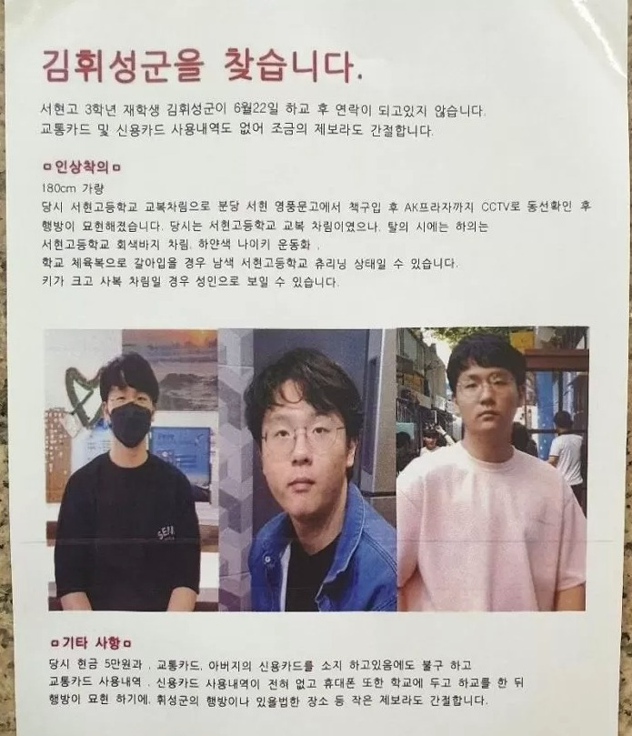 경찰은 분당 서현역에서 김 군의 집, 버스 종점까지 이어진 버스정류장 폐쇄회로(cc)tv도 분석하고 있다. 경찰은 김 군의 마지막 행적지인 버스정류장에 정차한 버스 블랙박스를 모두 수거해 영상을 분석 중이지만. 6월 22일 방과후 gs25 분당 한양점에서 교통카드에 만 원을 충전하면서 종량제 봉투를 구입하였다. 26일 경기 분당경찰서에 따르면 서현고 3학년에 재학 중인 김휘성(19)군은 지난 22일 하교 후 오후 4시 40분쯤부터 이날까지 연락이 두절된 상태다. 지난 22일 실종된 분당 서현고 3학년 김휘성군이 실종 7일째인 28일 인근 야산에서 숨진 채 발견됐다.